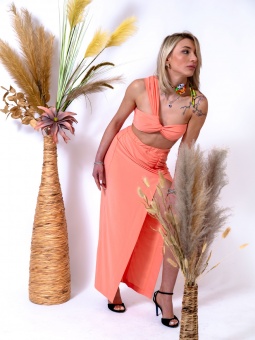 Draped high-waisted midi skirt in eco-sustainable fabric in certified recycled polyester, its elasticity wraps and adapts to every curve of the body. Elastic waist and deep front space. Fabric: 95% Recycled Polyester - 5% Stretch.