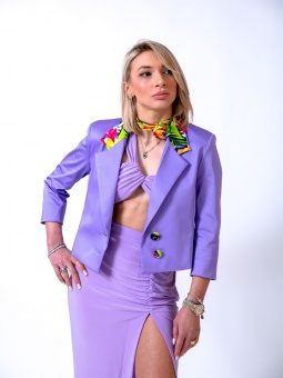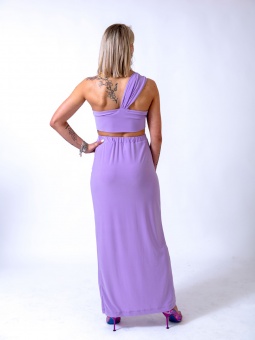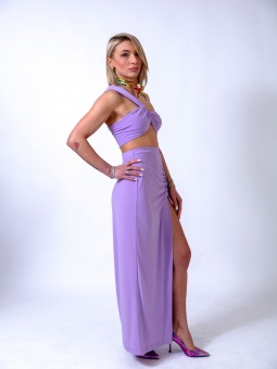 Draped high-waisted midi skirt in eco-sustainable fabric in certified recycled polyester, its elasticity wraps and adapts to every curve of the body. Elastic waist and deep front space. Fabric: 95% Recycled Polyester - 5% Stretch.