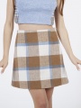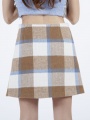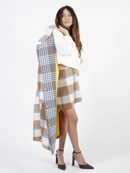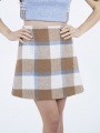 Short skirt with law waistline, made of double face large checked fabric; backed with yellow lining. With side zipper.