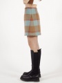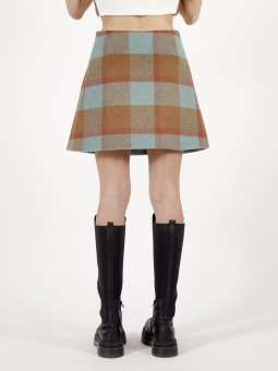 Gonna corta svasata in tessuto duble a scacco grande, interno foderato con tessuto colore giallo. Apertura laterale con zip.